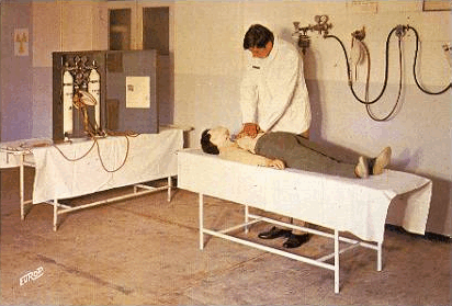 Intitulé : Massage Electro-therapy - 1901. Origine : Angleterre Localisée : Gillingham, Dorset, Royaume-Uni Propriété : CFDRM, Paris, France. Datation de l'archive : datée de 1921. Date d'entrée dans la collection : lundi 19 mars 2012, 13:43 Type : Carte postale Genre : Scène extérieure. Mots-clefs : Éditeur : Photographe : Format : 13,08 x 8,08cm. N° de ref. : Description : Massage par Electro-therapy sur un patient allongé sur