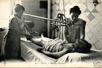 Intitulé : 122 Vichy Origine : Vichy - France. Localisée : Paris, France. Propriété : Musée du CFDRM. Datation de l'archive : oblitérée du 14 septembre 1913 (dimanche) Date d'entrée dans la collection : dimanche 23 septembre 2012 Type : Carte postale Genre : scène de massage sous l'eau (femmes) Photographe : Format : 140 mm x 92 mm N° de ref. : Description : Verso carte postale écrite, timbrée et oblitérée du 14 septembre 1913 (dimanche). Commentaires : Nous avons un massage de l'épaule et de la cuisse cumulé au jet. |