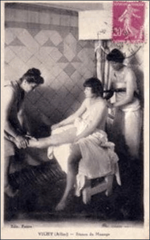 Vichy Origine : Vichy, France Localisée : Propriété : _ Datation de l'archive : début du 20ème siècle Date d'entrée dans la collection : _ Type : Carte postale Genre : scène d'intérieur de massage et de douche assise Dessinateur : Format : 9 x 14 cm N° de ref. : Description : Commentaires : Sur cette carte nous avons un cas intéressant de massage directement corrélé à la douche spécifiée comme assise et nommée "douche de Vichy." |