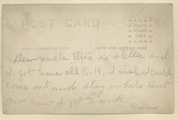 and Electric light Treatment and Massage. Origine : USA. Localisée : _ Propriété : _ Datation de l'archive : 3 janvier 1914 Date d'entrée dans la collection : _ Type : Carte postale Genre : _ Dessinateur : Format : 9 x 14 cm N° de ref. : Description : Verso carte postale écrite à la machine à écrire, timbrée et oblitérée aux USA. Commentaires : |