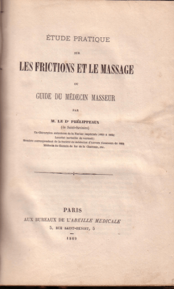 d'édition : 1869, 1ère édition. Réédition : 1870 Etude pratique sur les frictions et le massage ou guide du médecin masseur Paris : L’Abeille médicale Lieu d'impression : Paris. LANGUE : français FORMAT : 1 volume, complet, 21,8 x 14,1 cm, 187 pages. Type : Livre en un volume. ISBN : aucun Droits : libres Crédit photographique : Le CFDRM. Identifiant : http://www.cfdrm.fr Numéro d'archives RELIURE : demi-basane vert, dos lisse orné. ILLUSTRATIONS : non. ETAT : très bon, BIOGRAPHIE & THÈME : Gymnastique POIDS : |