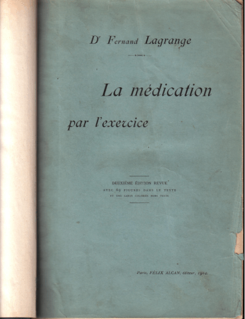 : AUTEUR : Lagrange Fernand, Interne en 1869, Lauréat de l'Académie de médecine et de l'Institut, il deviendra à 55 ans Membre fondateur et Vice-Président de la Société de Kinésithérapie lors de sa création en 1900. ÉDITEUR : Félix Alcan. Date d'édition : 1904 Seconde édition. Régime politique du contexte de