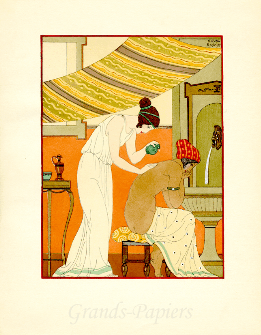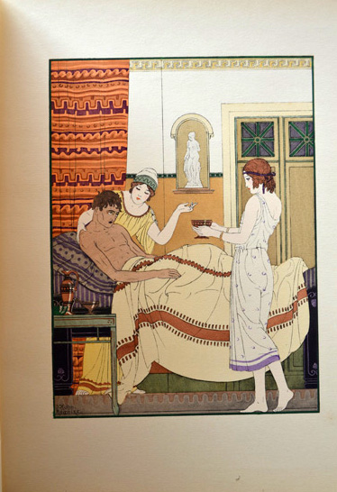 : AUTEUR : Hippocrate (oeuvre complète en 4 volumes) Traduction de Littré. Dirigé par : Javal, Leblanc et Bourdeaux. ÉDITEUR : ? Date d'édition : 1932-1934. Lieu d'impression : Paris, France, Imprimé sur les presses de Coulouma. LANGUE : français FORMAT : in-4°, 4 vol. forts, XVI + 288p, 2ff + 296pp, 2ff + 288pp, 2ff + 335pp. ISBN : Droits : domaine public Crédit photographique : Le CFDRM. Identifiant : http://www.cfdrm.fr Numéro d'archives : RELIURE : Pleine basane tête de nègre, estampée à l'antique à froid, titre doré sur dos lisse. ILLUSTRATIONS : Bien complet des 64 illustrations hors-texte de Kuhn-Régnier, protégées par des serpentes, et coloriées au pochoir par Jacomet. L’illustration est inspirée des grecs anciens. |