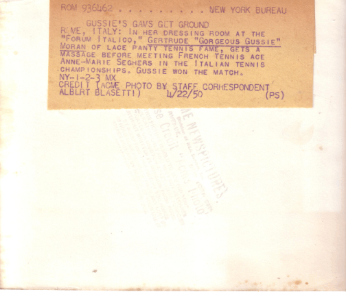 Intitulé : Gussie-Moran Sport concerné : Tennis Origine : USA, photo prise lors d'un meeting en France. Lieu de localisation : Wilmette, Illinois, États-Unis Propriété : Musée du CFDRM de Paris Datation de l'archive : samedi 22 avril 1950 Date d'entrée dans la collection : mercredi 9 février 2011 Type : photo originale Genre : massage médical sportif. Photographe : ACME Photo by staff correspondent Albert Blasetti Format : 18,3 x 22,3cm Droit non commerciaux : libres N° de ref. : Description : Commentaires : Massage de la tennisman Gussie-Moran avant de gagner en Italie le samedi 22 avril 1950. |