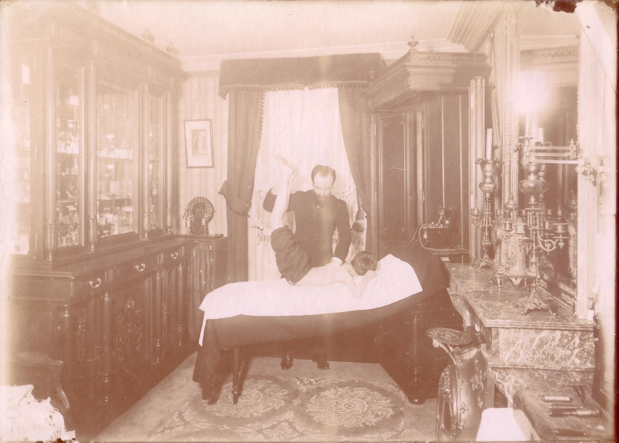 Musée du CFDRM de Paris 2015 Photos libres de droits non commerciaux. Datation de l'archive : cira 1900. Date d'entrée dans la collection : samedi 30 mai 2015, 12:10. Type : Photographies au gélatino-bromure d’argent. Genre : scène de massage d'intérieur Photographe (& personnages) : inconnus. Format : 18 x 13cm. N° de ref. : Description : Il s'agit d'un praticien dont on ne connaît pas le nom exerçant à son domicile. Il pratique l'électrothérapie ou des manipulations sur des femmes, des hommes et un enfant. Nous avons divisé ce lot en deux parties, les photos de massages sur table et celles sur chaise. Ce que cette série nous révèle est assez remarquable ; le cliché n° 11 présente au fond à droite de la pièce une l'armoire classique qui est en fait un buffet parfaitement bien fermé, alors que sur les photos impliquant la table de massage, nous observons que non seulement la porte haute de gauche, près de la fenêtre, s'ouvre sur son intérieur et nous montre qu'elle ne contient "rien", mais le côté normalement fixe du meuble bascule sur l'extérieur de la pièce et semble abriter la table massage qui parait ne disposer que d'un seul pied (photos 5, 6, 7 et 8). Il parait probable que nous soyons-là en présence d'un des rarissimes exemplaire de mobilier professionnel spécialement conçu pour dissimuler une table de massage pour une pièce exiguë. Commentaires : Lot de 19 photos acquises à Paris auprès d'un marchand de photos professionnel qui les avait obtenu dans une vente aux enchères de Lyon. |