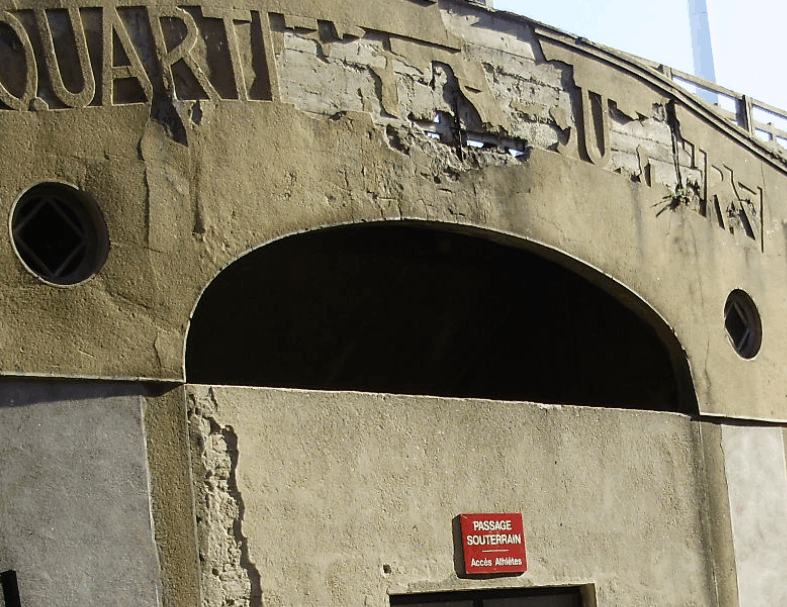 Ici nous avons un très beau témoignage datant probablement de la création de ce stade 1920/30 avec le mot douche et massage écrits sur la façade d'un bâtiment public. C'est ce morceau qui fut découpé et ré-installé sur le parcours destiné à la marche et au footing.